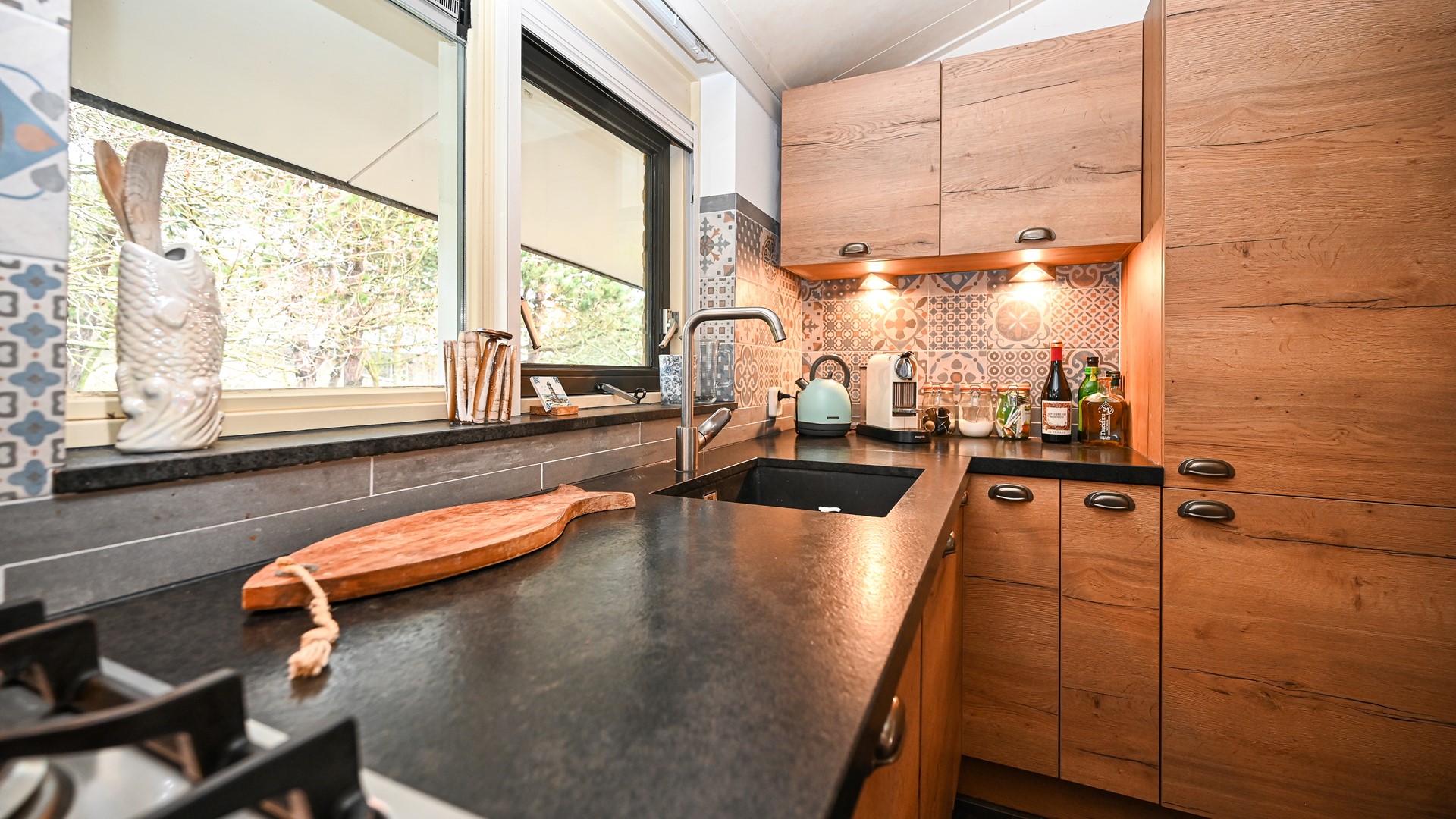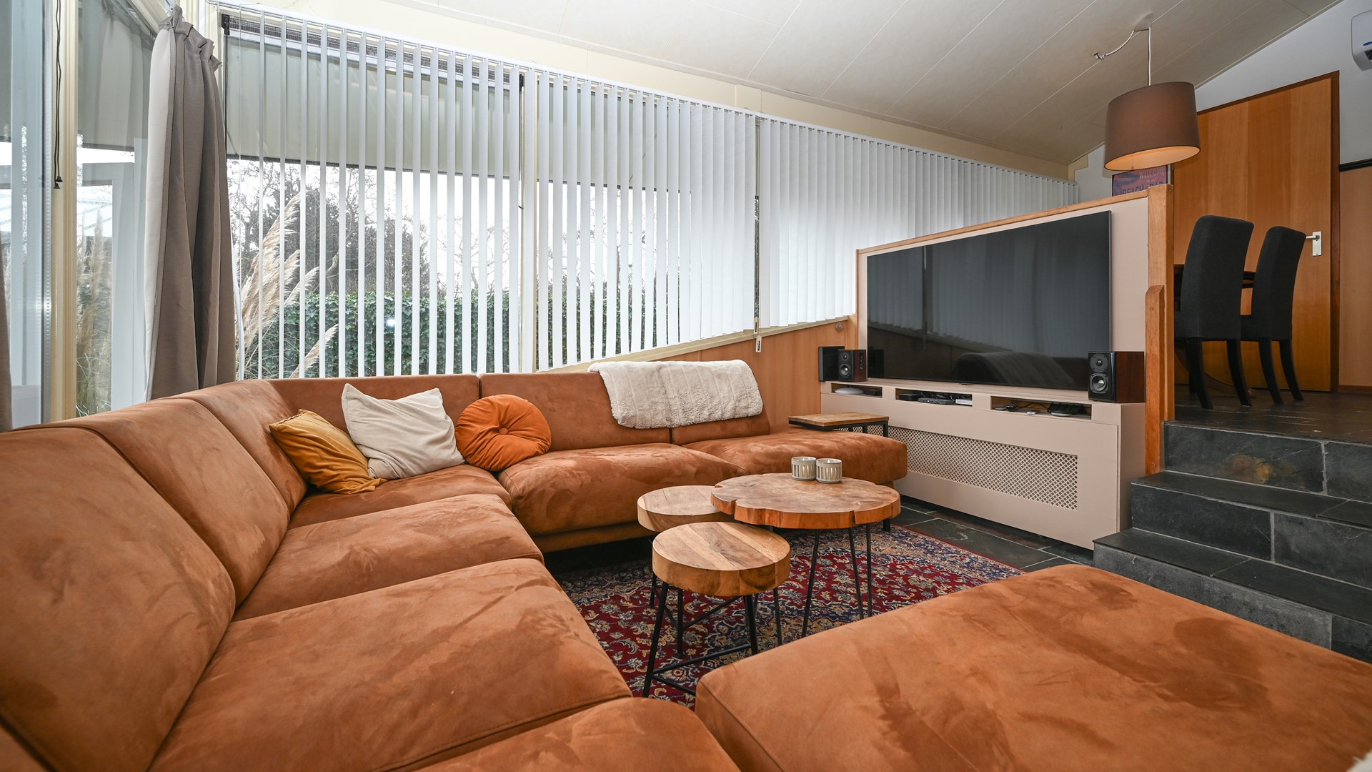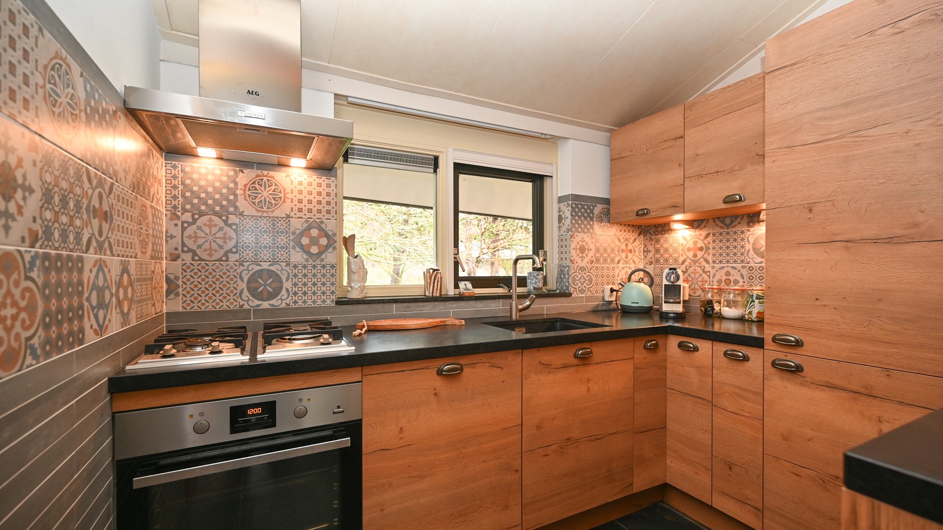 Deze recreatiewoning is ontworpen in een split-level concept, wat zorgt voor een verrassende indeling en een speels woonruimte. De woonkamer, ingericht met een nieuwe zithoek en smart-tv, geniet van veel natuurlijk licht dankzij de grote raampartijen en openslaande deuren naar het fraai aangelegde en royale terras. De open keuken is voorzien van hoogwaardige inbouwapparatuur en een aansluitende eethoek. Op dit woonniveau vindt u tevens een praktische technische ruimte met een was- en droogcombinatie, alsook een ruime tweepersoonsslaapkamer met ensuite badkamer, die extra comfort en privacy biedt voor gasten of eigen gebruik. Deze slaapkamer met badkamer kan eenvoudig afgesloten worden bij verhuur, voor optimale flexibiliteit.