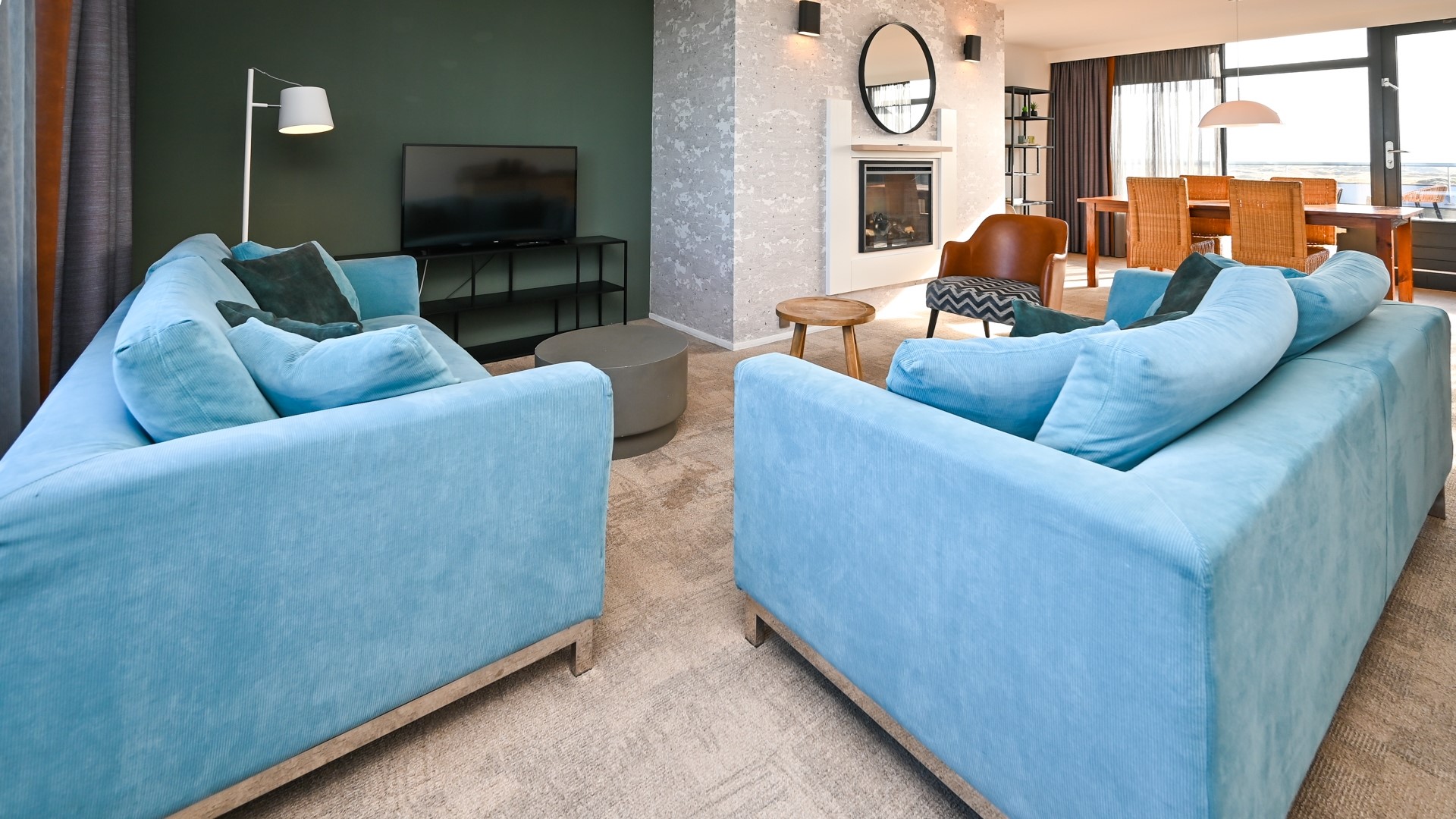 TE KOOP: Luxe 4-persoons Family Suite in Paal 8 Hotel aan Zee, met panoramisch uitzicht over de Noordzee en duinen.